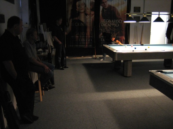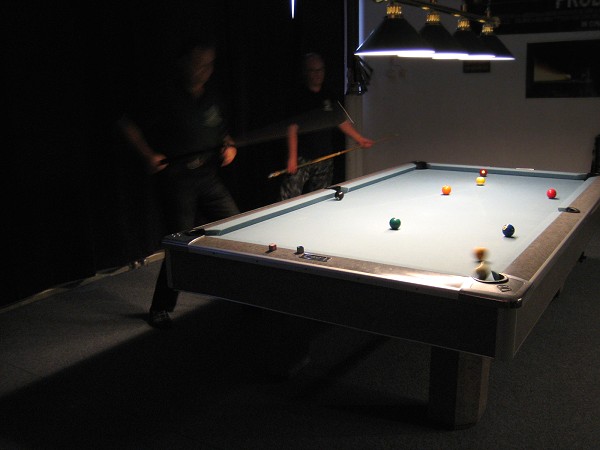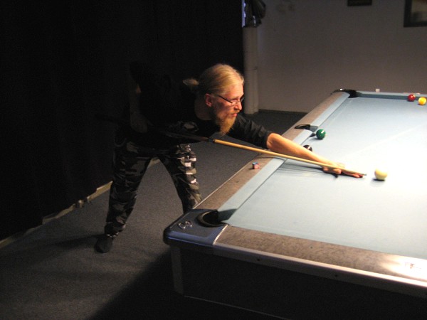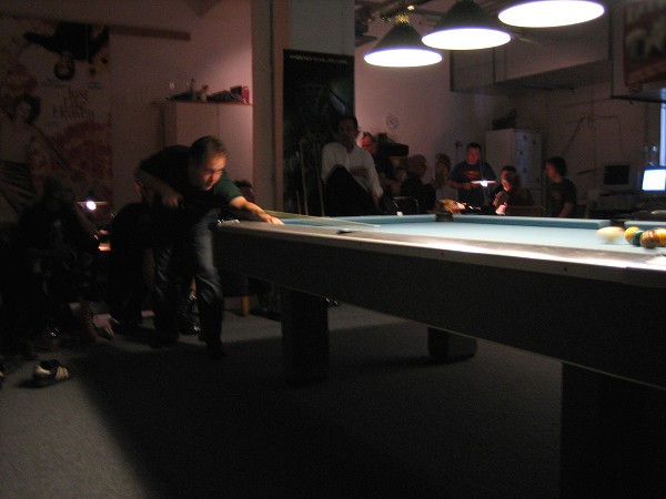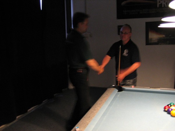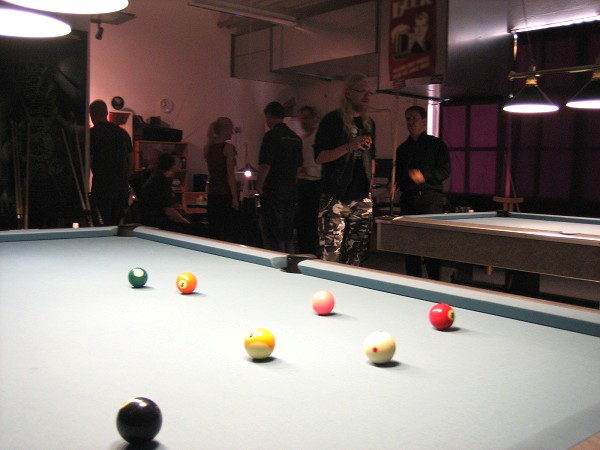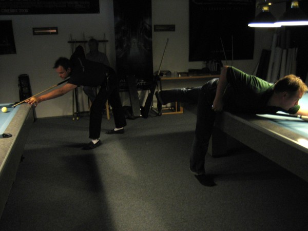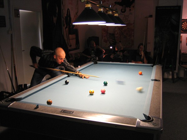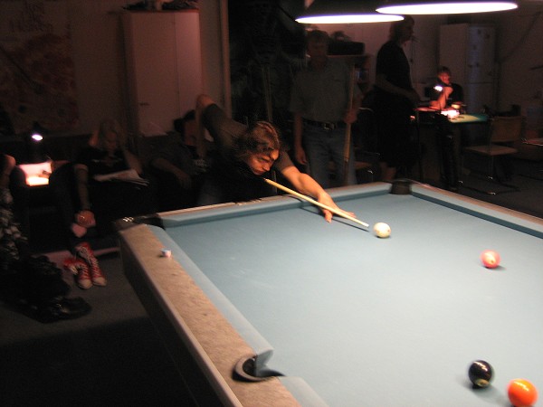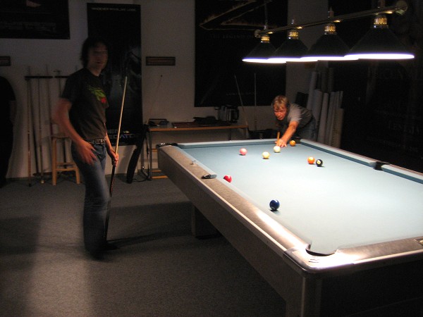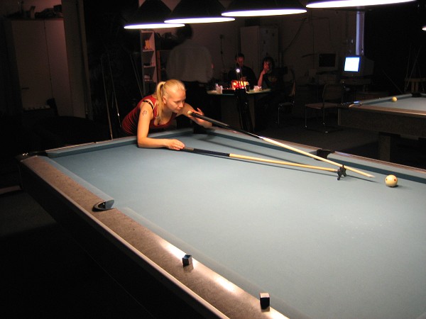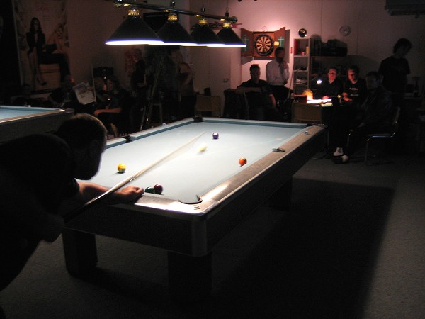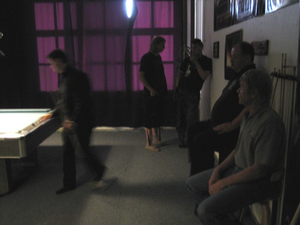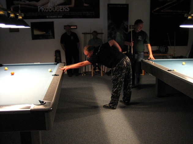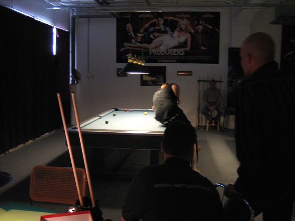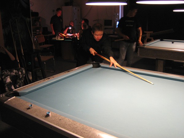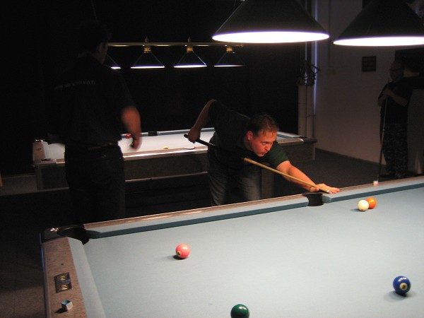 | Säkittäjien, Säätäjien ja PB Dieselin kolmiottelu 23.08.2008Pyhäjärven Siimaseura ry:hyn liittyi kesän 2008 aikana niin monta uutta jäsentä, että kisaisäntä Mika Saloselle syntyi väistämättä ajatus kolmiottelun järjestämisestä. Päivämääräkin sen jo kertoi, ettei kahta joukkuetta ilman kolmatta... Niinpä Pyynikille kutsuttiin 2. divisioonakauteen 2008-2009 valmistautunut PB Diesel, jota vastaan asettuivat Siimaseuran omat liigajoukkueet. Kotijoukkueet Siimaseuran Säkittäjät ja Siimaseuran Säätäjät saivat jalkeille viisi pelaajaa. Koska PB Dieselillä oli seitsemän pelaajaa, kussakin ottelussa pelattiin seitsemän peliä, jotta kaikki dieseliläiset saivat pelata kaksi peliä päivän aikana. Joillekin Säkittäjien ja Säätäjien pelaajille tuli arvonnan tuloksena kaksi pelivuoroa yhdessä ottelussa. Ystävyysotteluissa pelattiin 9-palloa viiteen erävoittoon Pirkanmaan liigan sarjatasojen mukaisesti määräytyvillä tasoituksilla. Ensimmäisen erän aloitti aina pelaaja, joka joutui antamaan eteen. Muuten mentiin normaaleilla liigasäännöillä, mutta neuvominen oli sallittua ja jopa toivottavaa. Oheiset pöytäkirjat eivät kuitenkaan kerro todellista pelijärjestystä. Kaikkia kolmea ystävyysottelua pelattiin nimittäin samanaikaisesti ja pelejä laitettiin alulle niin, etteivät odotusajat muodostuisi mahdottoman pitkiksi. Alla olevat kuvat kertovat, missä järjestyksessä pelit todellisuudessa pelattiin. Lähtökohdat ja joukkueiden kokoonpanotRavintola Pool-Boolissa 2. divisioonan kotiottelunsa pelaava PB Diesel lähti ystävyysotteluihin kokoonpanolla Toni Hakulinen, Keijo "Keke" Heikkinen, Juha Iloranta, Matti "Masa" Järvinen, Antti Karimaa, Sanna Mustonen ja Markus Palosaari. Heistä Keke ja Juha olivat uusia dieseliläisiä. Henkilökohtaisen kutsun sai itseoikeutetusti myös joukkueen monivuotinen runkopelaaja ja yhteyshenkilö Piia Paldanius, mutta tällä kertaa hän ei ennättänyt pistämään siimaseuralaisia solmuun. Mestaruussarjaporukka Siimaseuran Säkittäjät pelasi miehistöllä Olli Järvinen, Timo Leskinen, Sami Saariaho, Mika Salonen ja Jani Ålander. Joukkueeseen lukeutuva Janne Forsman oli epähuomiossa sopinut itselleen muuta ohjelmaa, joten sekä oman väen että vierailijoiden pettymykseksi Jannea ei saatu paikalle. Myös Marja Lindén olisi ollut oiva lisä Säkittäjien riveihin, mutta hänellekin tuli muuta menoa. Siimaseuran Säätäjistä mukana olivat Antti Patronen ja Tauno "Tane" Rajala, jotka oli nimetty 1. divisioonassa pelaavaan joukkueeseen kaudeksi 2008-2009. Poissa olivat joukkueeseen jo nimetyt Ollimatti Hukkanen, Ville Juusela ja Juha Lindroos, kuten myös kutsun saanut ex-kippari Ville Björn. Ystävyysotteluissa pelasivat joukkuetta kaksi edelliskautta edustaneet Teppo Klemetti, jonka tuleva kausi oli vielä hämärän peitossa, ja armeijan harmaissa vuotensa viettävä Juho Saarikko. Säätäjien joukkueen täydensi Viljami Marjomäki, joka oli hiljattain liittynyt Siimaseuran rinkiin ja pohti liigapelaamistaan. Ystävyysottelun mielenkiintoa lisäsi se tosiseikka, että PB Dieselin Markus Palosaari oli hiljattain liittynyt Pyhäjärven Siimaseura ry:n jäseneksi. Siimaseuran Säkittäjät - PB DieselEnsimmäisenä aloitettiin mestaruussarjan ja 2. divisioonan joukkueiden välinen taistelu. Koska Siimaseuran Säkittäjät pelaa mestaruussarjassa ja PB Diesel 2. divisioonassa, pelattiin viiteen voittoon niin, että pelien alkaessa tilanne oli 0-2. Olli Järvinen sai vastaansa Markus Palosaaren ottelussa, joka päättyi 5-3. Hetkeä myöhemmin Jani Ålander pelasi Keijo Heikkistä vastaan ja onnistui kääntämään 0-2-alkuasetelman loppulukemiksi 5-3. Janille arvottiin PB Dieseliä vastaan käytyyn otteluun kaksi pelivuoroa, joten seuraavaksi hän voitti Juha Ilorannan jo tutuksi tulleeseen tapaan 5-3. Seuraavaksi olivat vastakkain Sami Saariaho ja PB Dieselin Matti Järvinen, tulos jälleen kerran 5-3. Seuraavassa pelissä tahti oli Olli Järvisen kannalta epämieluisa, sillä 0-2:sta alkanut peli Sanna Mustosta vastaan päättyi puhtaasti 0-5. Mika Salonen otti Toni Hakulista vastaan viisi perättäistä erävoittoa ja voitti 5-2. Alkuillasta Timo Leskinen hävisi Antti Karimaalle 0-5, mutta Siimaseuran Säkittäjät voitti koko ottelun pelein 5-2. Siimaseuran Säätäjät - PB DieselToisessa ottelussa Siimaseuran Säätäjät  Ottelun avasivat Juho Saarikko ja Sanna Mustonen, tulos 4-5. Viljami Marjomäki aloitti urakkansa hienosti kukistamalla Matti Järvisen 5-2 pelissä, joka oli alkanut tasatilanteesta 2-2. Juhon toinen peli Toni Hakulista vastaan eteni lähtötilanteesta 1-2 lukemiin 1-5, joten syystäkin tyytyväiselle Tonille makoisa voitto. Viljamillekin arvottiin toinen peli PB Dieselin edustajaa vastaan, mutta Markus Palosaari oli etevämpi tuloksella 3-5. Antti Patronen hoiti osuutensa kepittämällä Keijo Heikkisen 5-3. PB Dieselin voitto varmistui, kun Tauno Rajala hävisi Antti Karimaalle 2-5. Teppo Klemetti kaunisteli loppulukemia voittamalla Juha Ilorannan 5-3, mutta koko ottelu päättyi 3-4. Siimaseuran Säkittäjät - Siimaseuran SäätäjätSiimaseuran joukkueiden kohdatessa lähtötilanne oli pääsääntöisesti 0-1, koska Säkittäjien pelaajat joutuivat antamaan erän verran eteen. Viljami Marjomäen tasoitus oli kaksi, joten miehen pelit alkoivat tilanteesta 0-2. Mika Salosen ja Teppo Klemetin avauspelissä Teppo voitti avauserän, mutta Mika loput päättäen pelin erälukemiin 5-2. Timo Leskinen ja Tauno Rajala pelasivat vastakkain, lukemat päinvastoin eli 2-5. Sami Saariaho vei Säkittäjät johtoon voittamalla Antti Patrosen kontrassa 5-4. Jani Ålander sai vastaansa hetken huilanneen Teppo Klemetin, joten tuloksen 2-5 myötä ottelu oli yhtäkkiä tasan. Sanna Mustoselle kärsimästään 0-5-tappiosta sisuuntunut Olli Järvinen ei antanut Juho Saarikolle siimaa vaan voitti tyylikkäästi 5-2. Mika Salonen ja Sami Saariaho ratkaisivat tasaisesti alkaneen ottelun lo