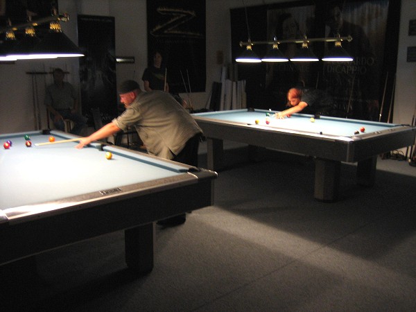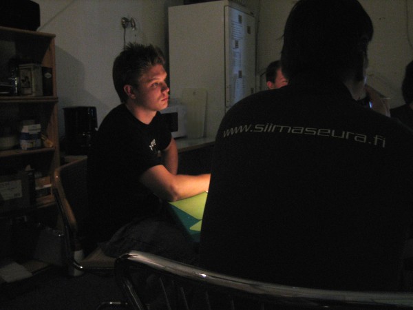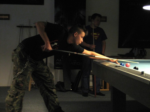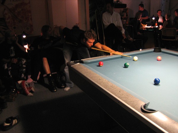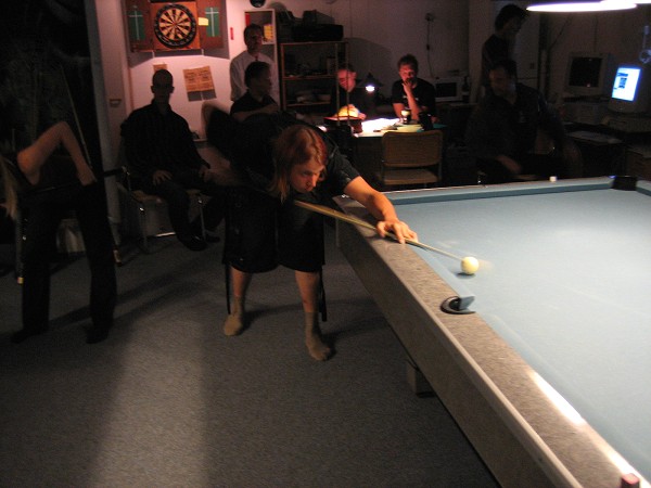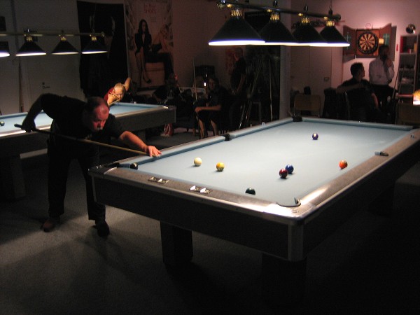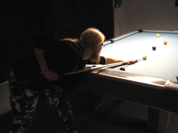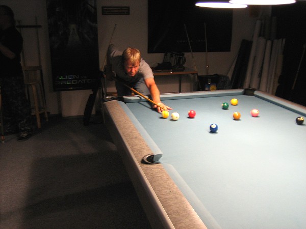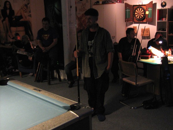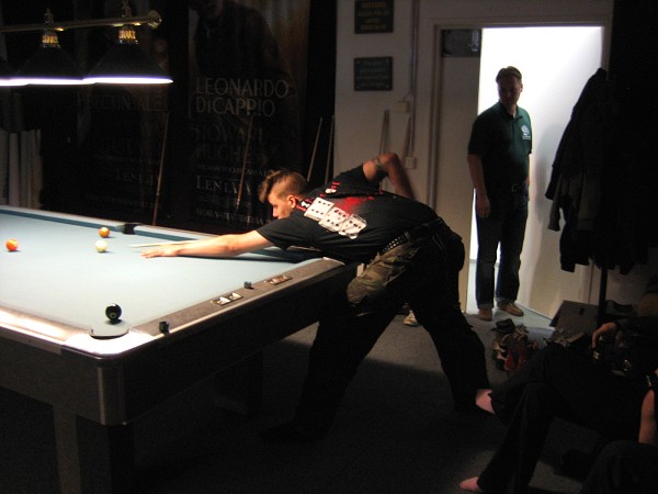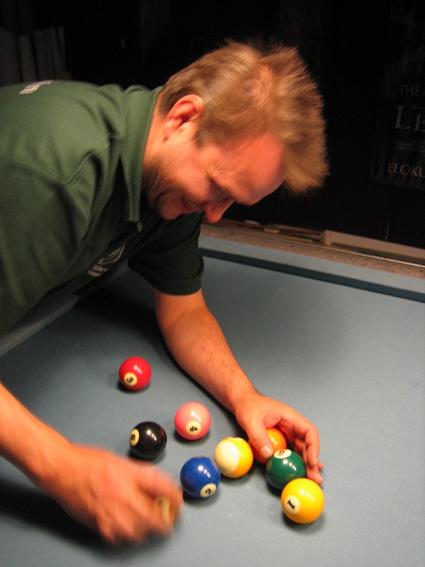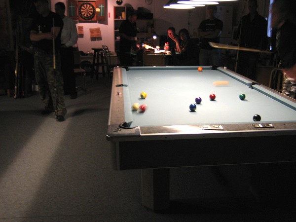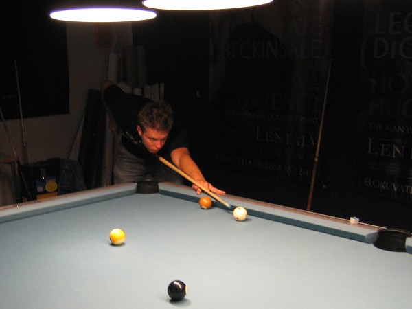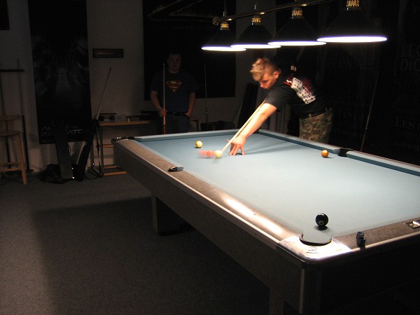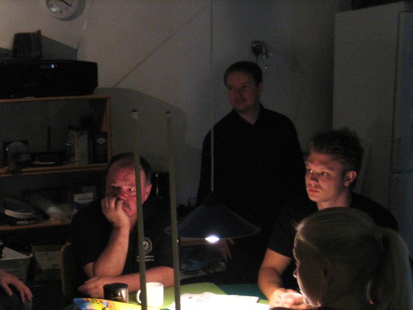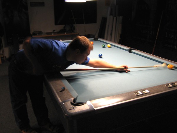 | Säkittäjien, Säätäjien ja PB Dieselin kolmiottelu 23.08.2008Pyhäjärven Siimaseura ry:hyn liittyi kesän 2008 aikana niin monta uutta jäsentä, että kisaisäntä Mika Saloselle syntyi väistämättä ajatus kolmiottelun järjestämisestä. Päivämääräkin sen jo kertoi, ettei kahta joukkuetta ilman kolmatta... Niinpä Pyynikille kutsuttiin 2. divisioonakauteen 2008-2009 valmistautunut PB Diesel, jota vastaan asettuivat Siimaseuran omat liigajoukkueet. Kotijoukkueet Siimaseuran Säkittäjät ja Siimaseuran Säätäjät saivat jalkeille viisi pelaajaa. Koska PB Dieselillä oli seitsemän pelaajaa, kussakin ottelussa pelattiin seitsemän peliä, jotta kaikki dieseliläiset saivat pelata kaksi peliä päivän aikana. Joillekin Säkittäjien ja Säätäjien pelaajille tuli arvonnan tuloksena kaksi pelivuoroa yhdessä ottelussa. Ystävyysotteluissa pelattiin 9-palloa viiteen erävoittoon Pirkanmaan liigan sarjatasojen mukaisesti määräytyvillä tasoituksilla. Ensimmäisen erän aloitti aina pelaaja, joka joutui antamaan eteen. Muuten mentiin normaaleilla liigasäännöillä, mutta neuvominen oli sallittua ja jopa toivottavaa. Oheiset pöytäkirjat eivät kuitenkaan kerro todellista pelijärjestystä. Kaikkia kolmea ystävyysottelua pelattiin nimittäin samanaikaisesti ja pelejä laitettiin alulle niin, etteivät odotusajat muodostuisi mahdottoman pitkiksi. Alla olevat kuvat kertovat, missä järjestyksessä pelit todellisuudessa pelattiin. Lähtökohdat ja joukkueiden kokoonpanotRavintola Pool-Boolissa 2. divisioonan kotiottelunsa pelaava PB Diesel lähti ystävyysotteluihin kokoonpanolla Toni Hakulinen, Keijo "Keke" Heikkinen, Juha Iloranta, Matti "Masa" Järvinen, Antti Karimaa, Sanna Mustonen ja Markus Palosaari. Heistä Keke ja Juha olivat uusia dieseliläisiä. Henkilökohtaisen kutsun sai itseoikeutetusti myös joukkueen monivuotinen runkopelaaja ja yhteyshenkilö Piia Paldanius, mutta tällä kertaa hän ei ennättänyt pistämään siimaseuralaisia solmuun. Mestaruussarjaporukka Siimaseuran Säkittäjät pelasi miehistöllä Olli Järvinen, Timo Leskinen, Sami Saariaho, Mika Salonen ja Jani Ålander. Joukkueeseen lukeutuva Janne Forsman oli epähuomiossa sopinut itselleen muuta ohjelmaa, joten sekä oman väen että vierailijoiden pettymykseksi Jannea ei saatu paikalle. Myös Marja Lindén olisi ollut oiva lisä Säkittäjien riveihin, mutta hänellekin tuli muuta menoa. Siimaseuran Säätäjistä mukana olivat Antti Patronen ja Tauno "Tane" Rajala, jotka oli nimetty 1. divisioonassa pelaavaan joukkueeseen kaudeksi 2008-2009. Poissa olivat joukkueeseen jo nimetyt Ollimatti Hukkanen, Ville Juusela ja Juha Lindroos, kuten myös kutsun saanut ex-kippari Ville Björn. Ystävyysotteluissa pelasivat joukkuetta kaksi edelliskautta edustaneet Teppo Klemetti, jonka tuleva kausi oli vielä hämärän peitossa, ja armeijan harmaissa vuotensa viettävä Juho Saarikko. Säätäjien joukkueen täydensi Viljami Marjomäki, joka oli hiljattain liittynyt Siimaseuran rinkiin ja pohti liigapelaamistaan. Ystävyysottelun mielenkiintoa lisäsi se tosiseikka, että PB Dieselin Markus Palosaari oli hiljattain liittynyt Pyhäjärven Siimaseura ry:n jäseneksi. Siimaseuran Säkittäjät - PB DieselEnsimmäisenä aloitettiin mestaruussarjan ja 2. divisioonan joukkueiden välinen taistelu. Koska Siimaseuran Säkittäjät pelaa mestaruussarjassa ja PB Diesel 2. divisioonassa, pelattiin viiteen voittoon niin, että pelien alkaessa tilanne oli 0-2. Olli Järvinen sai vastaansa Markus Palosaaren ottelussa, joka päättyi 5-3. Hetkeä myöhemmin Jani Ålander pelasi Keijo Heikkistä vastaan ja onnistui kääntämään 0-2-alkuasetelman loppulukemiksi 5-3. Janille arvottiin PB Dieseliä vastaan käytyyn otteluun kaksi pelivuoroa, joten seuraavaksi hän voitti Juha Ilorannan jo tutuksi tulleeseen tapaan 5-3. Seuraavaksi olivat vastakkain Sami Saariaho ja PB Dieselin Matti Järvinen, tulos jälleen kerran 5-3. Seuraavassa pelissä tahti oli Olli Järvisen kannalta epämieluisa, sillä 0-2:sta alkanut peli Sanna Mustosta vastaan päättyi puhtaasti 0-5. Mika Salonen otti Toni Hakulista vastaan viisi perättäistä erävoittoa ja voitti 5-2. Alkuillasta Timo Leskinen hävisi Antti Karimaalle 0-5, mutta Siimaseuran Säkittäjät voitti koko ottelun pelein 5-2. Siimaseuran Säätäjät - PB DieselToisessa ottelussa Siimaseuran Säätäjät  Ottelun avasivat Juho Saarikko ja Sanna Mustonen, tulos 4-5. Viljami Marjomäki aloitti urakkansa hienosti kukistamalla Matti Järvisen 5-2 pelissä, joka oli alkanut tasatilanteesta 2-2. Juhon toinen peli Toni Hakulista vastaan eteni lähtötilanteesta 1-2 lukemiin 1-5, joten syystäkin tyytyväiselle Tonille makoisa voitto. Viljamillekin arvottiin toinen peli PB Dieselin edustajaa vastaan, mutta Markus Palosaari oli etevämpi tuloksella 3-5. Antti Patronen hoiti osuutensa kepittämällä Keijo Heikkisen 5-3. PB Dieselin voitto varmistui, kun Tauno Rajala hävisi Antti Karimaalle 2-5. Teppo Klemetti kaunisteli loppulukemia voittamalla Juha Ilorannan 5-3, mutta koko ottelu päättyi 3-4. Siimaseuran Säkittäjät - Siimaseuran SäätäjätSiimaseuran joukkueiden kohdatessa lähtötilanne oli pääsääntöisesti 0-1, koska Säkittäjien pelaajat joutuivat antamaan erän verran eteen. Viljami Marjomäen tasoitus oli kaksi, joten miehen pelit alkoivat tilanteesta 0-2. Mika Salosen ja Teppo Klemetin avauspelissä Teppo voitti avauserän, mutta Mika loput päättäen pelin erälukemiin 5-2. Timo Leskinen ja Tauno Rajala pelasivat vastakkain, lukemat päinvastoin eli 2-5. Sami Saariaho vei Säkittäjät johtoon voittamalla Antti Patrosen kontrassa 5-4. Jani Ålander sai vastaansa hetken huilanneen Teppo Klemetin, joten tuloksen 2-5 myötä ottelu oli yhtäkkiä tasan. Sanna Mustoselle kärsimästään 0-5-tappiosta sisuuntunut Olli Järvinen ei antanut Juho Saarikolle siimaa vaan voitti tyylikkäästi 5-2. Mika Salonen ja Sami Saariaho ratkaisivat tasaisesti alkaneen ottelun lo